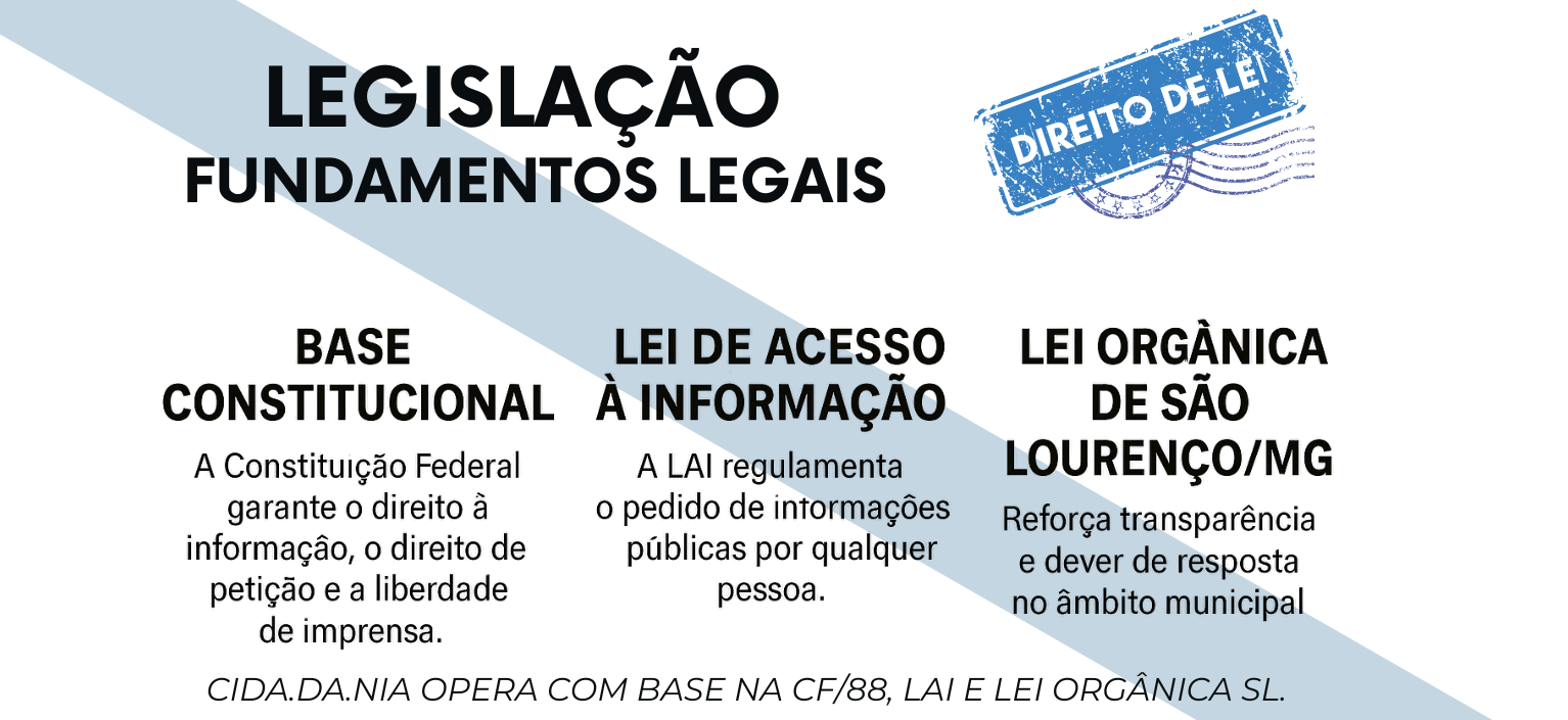 A Cida.da.Nia atua com base na Constituição Federal, na Lei de Acesso à Informação e na Lei Orgânica de São Lourenço/MG.